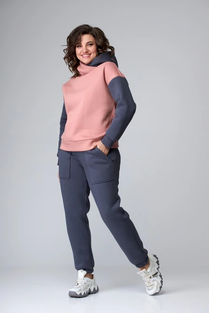На передних половинах брюк расположены накладные карманы с наклонным входом. По низу брюки присборены на манжет с эластичной тесьмой-резинкой. Универсальный костюм в современном ритме.