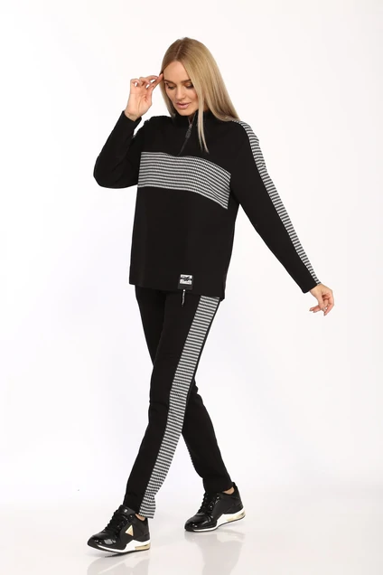 Стильный костюм весьма актуален и функционален в современном ритме жизни. Предлагаем джемпер и брюки из трикотажного полотна футер с отделочными элементами ткани-компаньона. Джемпер свободного прямого силуэта, линия плеча приспущена, рукава втачные, длинные, с центральной деталью из отделочной ткани, которая переходит на линию плеча. Горловина округлая с втачной мягкой стойкой, по переду лифа центральная застежка на декоративную молнию до уровня груди и декоративная деталь из отделочной ткани. Спинка цельная. По низу изделия широкая подгибка с небольшими разрезами по боковым швам. С левой стороны пришивной декоративный шеврон. Брюки прямые, чуть заужены к низу, с карманами в боковом шве. Вдоль бокового шва широкий лампас из отделочной ткани. Пояс притачной с эластичной тесьмой-резинкой и декоративным шнурком. Универсальный костюм для повседневной носки, очень комфортный и уютный.