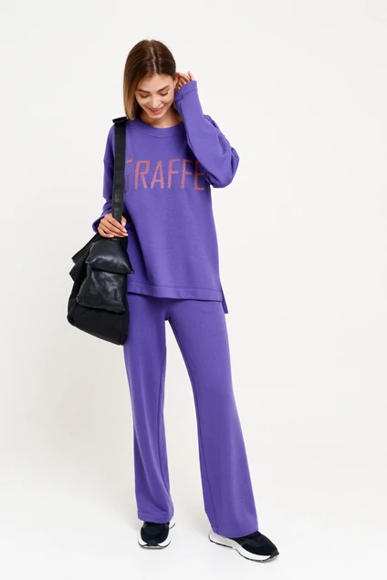 Комплект женский двухпредметный (джемпер+брюки) из трикотажной ткани. Джемпер женский, свободного силуэта, со спущенной линией плеча, длинным рукавом, удлиненной спинкой. Перед с декоративной вышивкой. Круглый вырез горловины обработан обтачкой. Брюки прямые от бедра, верх брюк с цельнокроеным поясом на резинке. В боковых швах функциональные карманы с отрезным бочком. Длина джемпера 70 см, рукав от горловины 72 см. Длина брюк 105 см.