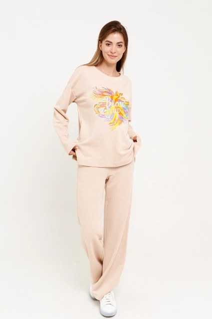 Комплект женский двухпредметный (джемпер+брюки) из трикотажной ткани. Джемпер женский, свободного силуэта, со спущенной линией плеча, длинным рукавом, удлиненной спинкой. Перед с декоративной вышивкой. Круглый вырез горловины обработан обтачкой. Брюки прямые от бедра, верх брюк с цельнокроеным поясом на резинке. В боковых швах функциональные карманы с отрезным бочком. Длина джемпера 70 см, рукав 72 см. Длина брюк 105 см.