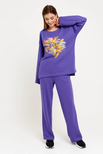 Комплект женский двухпредметный (джемпер+брюки) из трикотажной ткани. Джемпер женский, свободного силуэта, со спущенной линией плеча, длинным рукавом, удлиненной спинкой. Перед с декоративной вышивкой. Круглый вырез горловины обработан обтачкой. Брюки прямые от бедра, верх брюк с цельнокроеным поясом на резинке. В боковых швах функциональные карманы с отрезным бочком. Длина джемпера 70 см, рукав 72 см. Длина брюк 105 см.