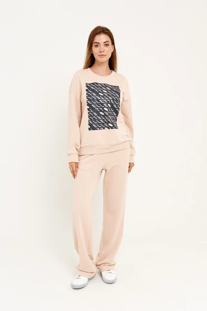 Комплект женский двухпредметный (джемпер+брюки) из трикотажной ткани. Джемпер женский, свободного силуэта, со спущенной линией плеча, длиной до середины линии бедер, длинным рукавом на притачной манжете, притачном поясе по низу. Перед с декоративным нанесенным принтом. Круглая горловина с отделочной обтачкой. Брюки прямые от бедра, верх брюк с цельнокроеным поясом на резинке. В боковых швах функциональные карманы с отрезным бочком. Длина джемпера 63 см, рукав 74 см. Длина брюк 105 см.