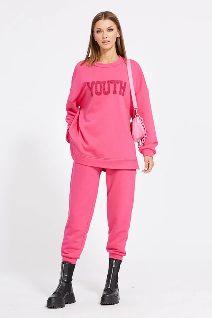 Комплект: джемпер + брюки. Комплект выполнен из однотонного трикотажного полотна. Джемпер прямого силуэта, покроя оверсайз, длиной ниже линии бедер. Перед и спинка цельные. Плечевой шов спущен. Горловина округлой формы. Рукав одношовный, на притачной манжете. В боковых швах джемпера шлицы. Спинка длиннее переда. Низ рукава и джемпера на манжете . Перед джемпера декорирован вышивкой "YOUTH". Брюки на притачном поясе с эластичной тесьмой, заужены к низу. Низ брюк на манжете.