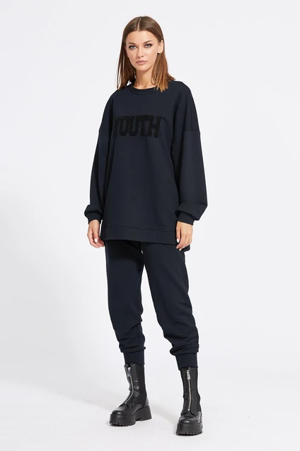 Комплект: джемпер + брюки. Комплект выполнен из однотонного трикотажного полотна. Джемпер прямого силуэта, покроя оверсайз, длиной ниже линии бедер. Перед и спинка цельные. Плечевой шов спущен. Горловина округлой формы. Рукав одношовный, на притачной манжете. В боковых швах джемпера шлицы. Спинка длиннее переда. Низ рукава и джемпера на манжете . Перед джемпера декорирован вышивкой "YOUTH". Брюки на притачном поясе с эластичной тесьмой, заужены к низу. Низ брюк на манжете.