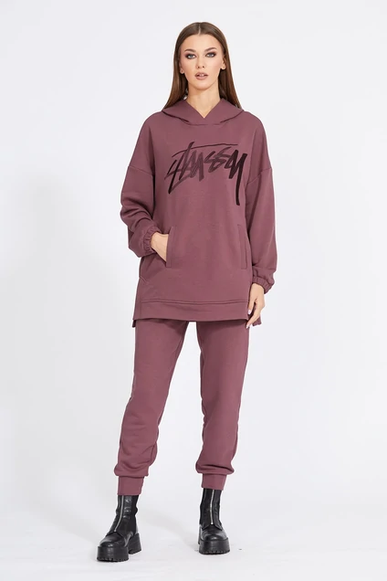 Комплект: джемпер + брюки. Комплект выполнен из однотонного трикотажного полотна. Джемпер прямого силуэта, покроя оверсайз, длиной ниже линии бедер. Перед и спинка цельные. Плечевой шов спущен. Горловина округлой формы, обработана капюшоном. Спереди карманы с листочками. Рукав одношовный. Низ рукава и джемпера на манжете. В боковых швах джемпера шлицы. Спинка длиннее переда. Джемпер декорирован вышивкой по переду. Брюки на притачном поясе с эластичной тесьмой, заужены к низу. Низ брюк на манжете.