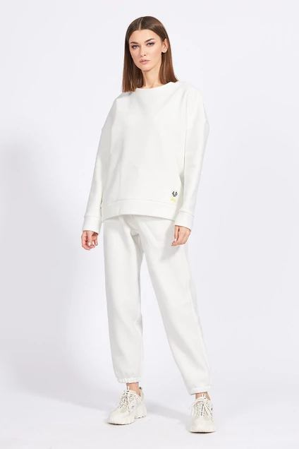 Комплект: свитшот + брюки. Комплект выполнен из однотонного трикотажного полотна на флисе. Свитшот О-образного силуэта, покроя оверсайз, длиной выше линии бедер. Перед и спинка цельные. Плечевой шов спущен. Горловина округлой формы, обработана бейкой. Рукав одношовный, на притачной манжете. Пройма углубленная. Низ свитшота на манжете. Перед свитшота декорирован по низу нашивкой. Брюки на притачном поясе с эластичной тесьмой, заужены к низу. Спереди боковые карманы с наклонным входом. Низ брюк присобран на эластичную тесьму.