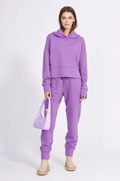 Комплект: худи + брюки. Комплект выполнен из трикотажного полотна. Худи прямого силуэта, длиной чуть ниже линии талии. Перед и спинка цельные. Горловина обработана капюшоном. Плечевой шов спущен. Рукав рубашечного покроя, одношовный. Низ рукава и низ худи на манжете из основной ткани. Брюки на притачном поясе с эластичной тесьмой, заужены к низу. Спереди боковые карманы с наклонным входом. Низ брюк на притачной манжете из основной ткани. В поясе обработаны петли и втянут шнур.