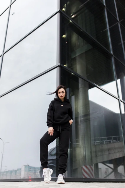 Костюм женский: штаны на резинке с карманамилисточкой + толстовка с капюшоном, карман- «кенгуру». Снизу и на запястьях толстовки, а также на штанах отделка из кашкорсе. Ткань Футер с начёсом