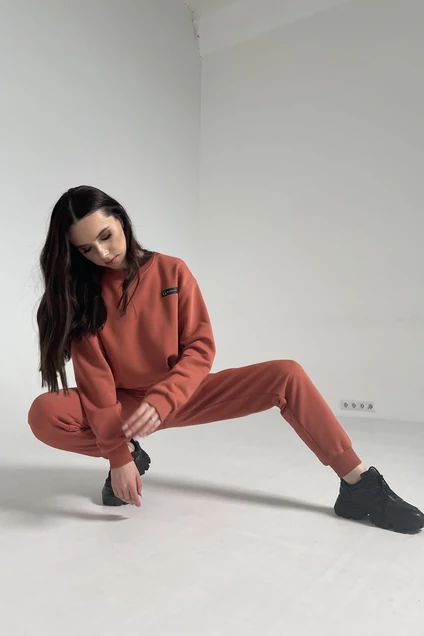 Костюм женский: штаны на резинке с карманами-листочкой + свитшот без карманов и капюшона. Снизу и на запястьях свитшота, а также на штанах, отделка из кашкорсе.