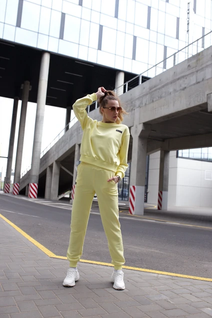 Костюм женский: штаны на резинке с карманами-листочкой + свитшот без карманов и капюшона. Снизу и на запястьях свитшота, а также на штанах, отделка из кашкорсе.