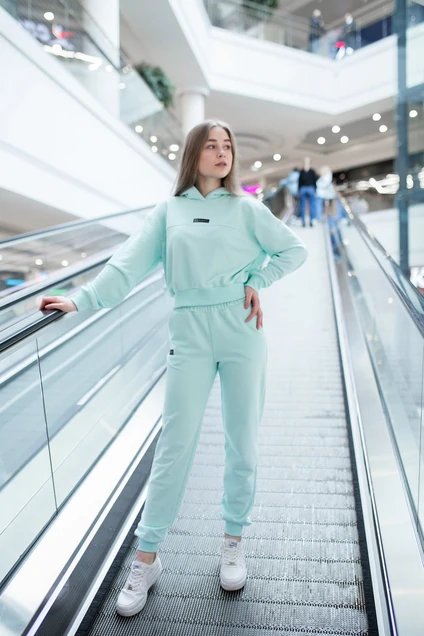 Костюм женский: штаны на резинке с карманами-листочкой + свитшот без карманов, с капюшоном. Снизу и на запястьях свитшот, а также на штанах, отделка из кашкорсе.
