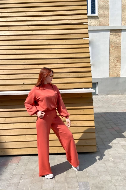 Костюм женский: расширенные к низу штаны “palazzo”, без карманов + укороченный свитшот, отделка из кашкорсе по низу изделия, без карманов, без капюшона. На запястьях отделка из кашкорсе.