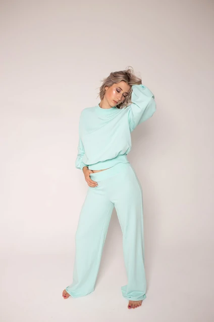 Костюм женский: расширенные к низу штаны “palazzo”, без карманов + укороченный свитшот, отделка из кашкорсе по низу изделия, без карманов, без капюшона. На запястьях отделка из кашкорсе.