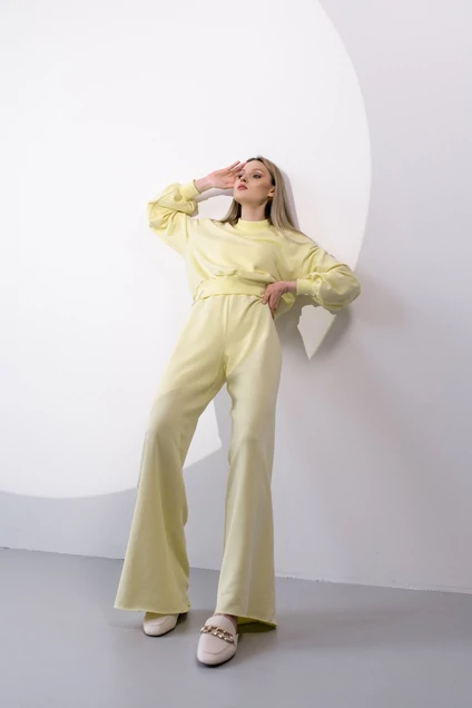 Костюм женский: расширенные к низу штаны “palazzo”, без карманов + укороченный свитшот, отделка из кашкорсе по низу изделия, без карманов, без капюшона. На запястьях отделка из кашкорсе.
