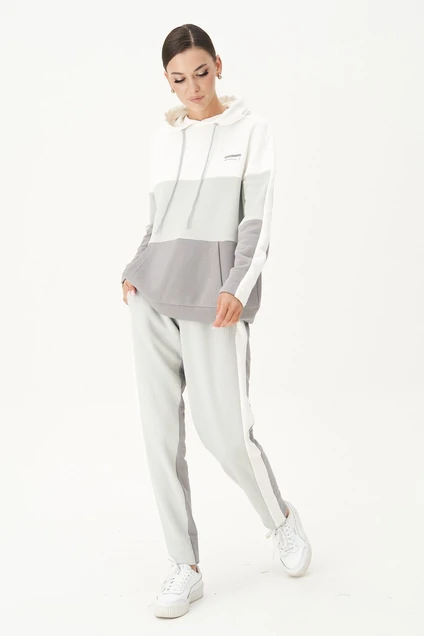Спорт - кэжуал, это ещё одна разновидность спортивного стиля в современной моде. Это одежда, не предназначенная для занятий спортом, но выражающая характерную для спорта эстетику с помощью динамичного кроя и отделки. Свободное, слегка оверсайз, худи и брюки-джоггеры. Худи выполнен в технике колор-блок линия плеча занижена, покрой рубашечный , капюшон. Брюки на эластичном поясе, с боковыми карманами, на манжете по низу, комбинированные: светлые передние половинки темные задние и контрастный белый лампас.