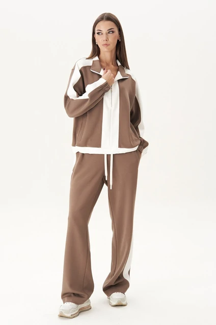 Контрастные лампасы на брюках, рукавах, по центру переда и низу придают модели особую динамичность и изысканность.