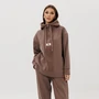 Толстовка свободного силуэта, рубашечного покроя с заниженной линией плеча, рукавом, расширенным в области оката, на притачной манжете, центральной застёжкой на тесьму-молнию и капюшоном с люверсами и отделочным шнуром. Полочка с прорезным карманом с листочкой. По низу изделия - притачной пояс.