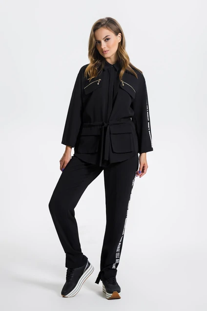 Модный женский костюм, в стиле спорт-шик, состоит из жакета и брюк. Жакет полуприлегающего силуэта, выполнен из высококачественной ткани с добавлением вискозы. Жакет по переду застежкой на пуговицы прикрытую потайной планкой. Перед жакета украшен имитацией нагрудных клапанов с металлическими молниями, со сборкой на кулису в которую протянут пояс из основной ткани и функциональными накладными карманами по низу. Рукава втачные, левый рукав украшен стильной текстовой печатью. Брюки прямые, слегка заужены к низу, на поясе с резинкой. В боковых швах функциональные карманы. Ширина низа брюк регулируется небольшим поясом из основой ткани с металлическими полукольцами. Левая брючина украшена стильной текстовой печатью. Костюм удобный и практичный, прекрасно подойдет для ежедневной носки. Длина жакета 68 см. Длина рукава жакета 45 см. Длина брюк 105 см.
