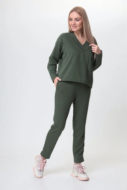 Костюм трикотажный, трехнитка. Состоит из джемпера и брюк. Джемпер прямой, длиной чуть выше линии бедра, плечо спущено, рукав длинный зауженный к низу. Низ рукава и низ джемпера с широкой подгибкой , отстроченный плоскошовкой. Горловина джемпера V- образной формы, с широкой обтачкой из кашкорсе . Справа спереди обработан накладной карман, с клапаном из кашкорсе. Плечевой, проймы и горловина отстрочены отделочными строчками 0,5 см. Брюки прямые, с карманами в боковых швах, с имитацией застёжки спереди, пояс на резинке из кашкорсе.