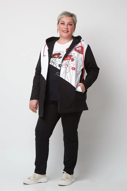 Удлиненный жакет прямого силуэта с застежкой на молнию. Капюшон несъёмный, с возможностью утяжки. Спереди два боковых кармана. Жакет имеет современный крой, поэтому станет идеальным решением на каждый день. Женский джемпер полуприлегающего силуэта с ярким цветочным принтом. Отлично подойдет для встреч с друзьями и путешествий. Состав джемпера: 92% хлопок, 8% эластан. Длина жакета по спинке - 76 см. Длина джемпера по спинке - 64,5 см.