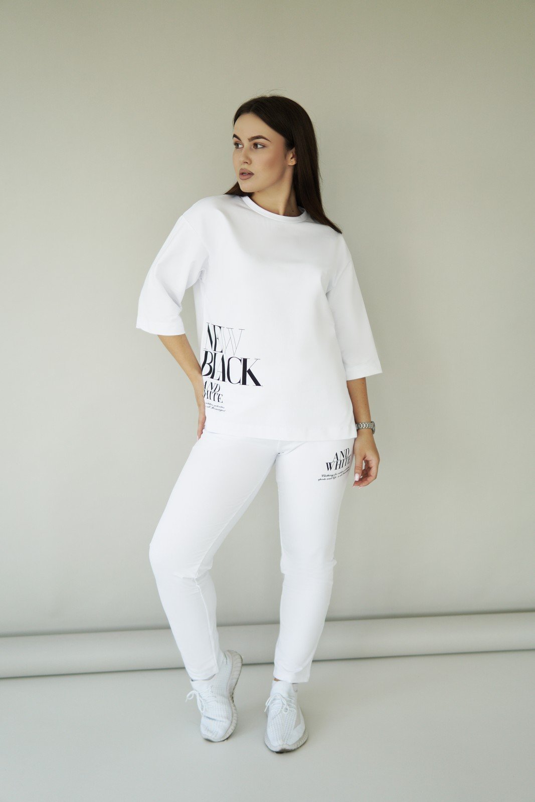 Стильный спортивный женский костюм двойка. Состоит из джемпера и брюк. Джемпер свободного кроя со спущенной линией плеча, рукав 3/4. Оригинальный дизайн и принт делают джемпер стильным и современным. Модные брюки из легкого футера, полуприлегающего кроя с резинкой на талии. Врезные боковые карманы. Костюм отлично подойдет для прогулок на свежем воздухе и загородных поездок.