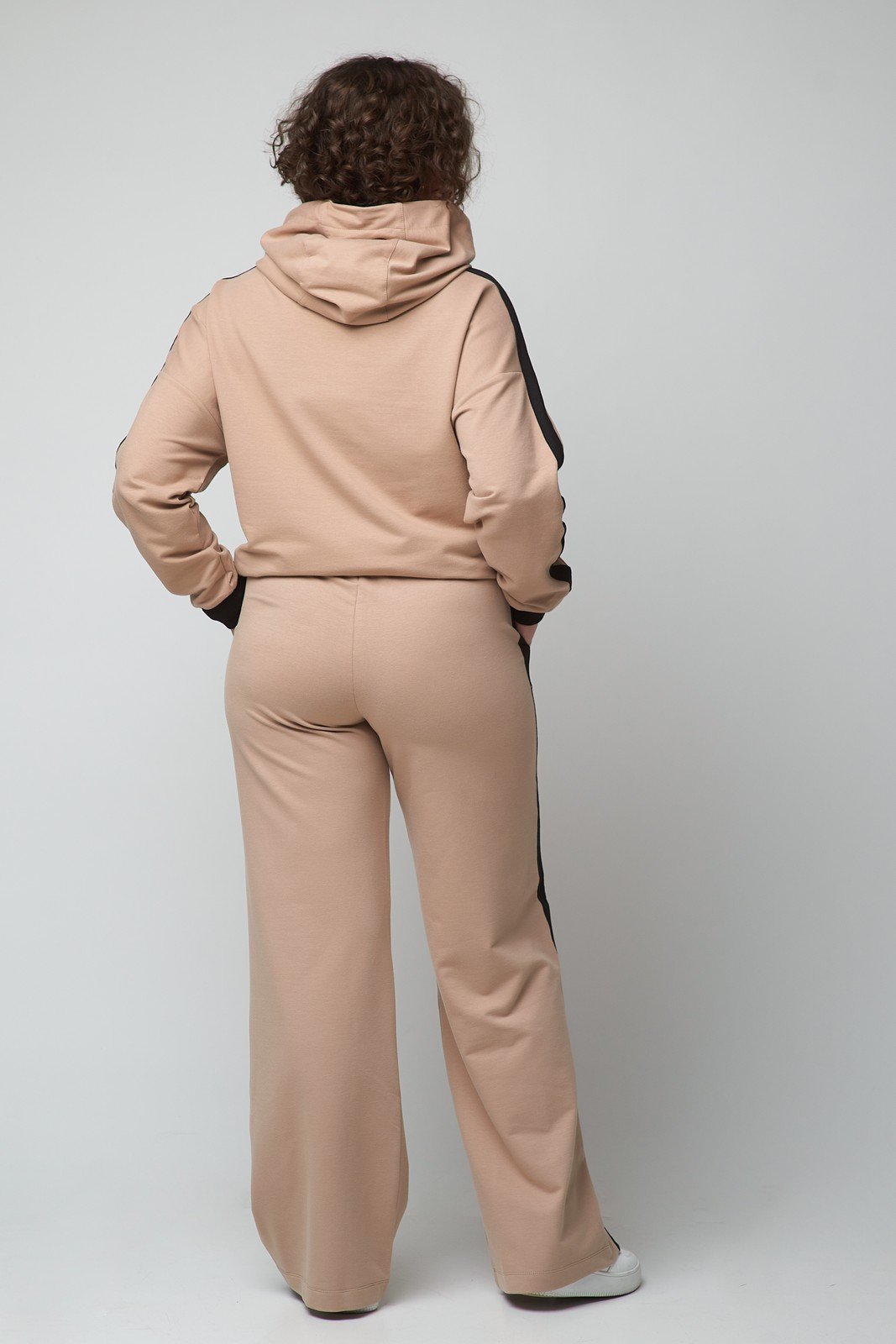 Костюм спортивный женский состоит из толстовки и брюк. Женская толстовка свободного силуэта с капюшоном обеспечивает свободу движений во время прогулки. Линия плеча спущена, длинные рукава завершаются манжетами. С лицевой стороны боковые прорезные карманы. Широкие женские брюки имеют просторный крой, удобный пояс, комфортную свободную посадку. Брюки с прорезными карманами по швам делают образ элегантным, визуально вытягивают силуэт. Оригинальная модель, которая идеально сидит на фигуре любого типа благодаря завышенной линии талии. Костюм спортивный отлично подойдет для прогулок на свежем воздухе и загородных поездок. Длина толстовки по спинке - 69 см. Длина брюк c поясом - 105 см.