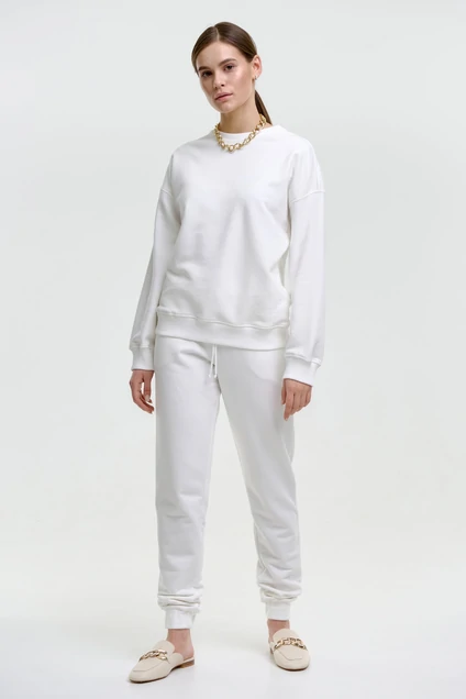 Стильный спортивный костюм из натурального хлопка (95% хлопок) в молочном цвете прямого силуэта, не светится. Брюки заужены к низу, на манжете с резинкой, классической средней посадки, шнурок на талии, дополненный люверсами и декоративными фиксаторами в цвете никель, карманы по бокам, идеальная посадка по фигуре зрительно вытягивающая силуэт. Свитшот - прямого силуэта с длинным рукавом и спущенной линией плеча станет прекрасным дополнением casual и спортивного образа. Модель выполнена из натурального мягкого трикотажного полотна высокого качества - футер трехнитка из хлопковой пряжи пенье,- прошедшего специальную обработку, благодаря которой трикотаж устойчив к истиранию, появлению затяжек и катышек средней плотности. Горловина, низ рукава и низ изделия отделаны трикотажной резинкой. По швам плеча, низа рукава, низа изделия проложена двойная декоративная строчка. Такая форма изделия и способ пошива не стесняют движений, обеспечивая дополнительный комфорт при носке, что отмечают наши покупательницы. А декорративная кожаная бирка с тиснением на спине и лаконичное лого на передней части изделия в белом цвете - придают изделию яркости и деликатной эффектности.