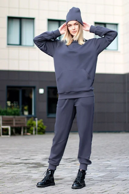 Костюм женский повседневный, спортивного стиля, небольшой оверсайз покрой из комфортной ткани (футера), состоящий из худи и брюк. Худи с капюшоном – прямого силуэта, по низу изделия с притачной манжетой. На