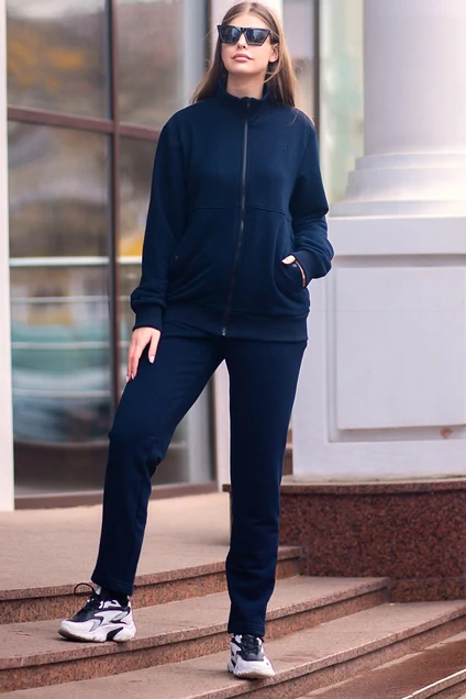 Костюм женский повседневный, спортивного стиля из комфортной ткани ( петельного футера тринитки), состоящий из джемпера и брюк. Джемпер – прямого силуэта, с застежкой молнией по перееду, по низу изделия с притачной манжетой с воротником - стойкой. На переде горизонтальные подрезы, карманы обработаны в рельефных швах, фиксирующие кнопкой. вышивка - логотип в цвет ткани на левой стороне переда. Рукава втачные одношовные длинные с притачной по низу манжетой. Отделочные строчки вдоль молнии, по рельефным швам, входу в карман. Брюки немного зауженные к низу, с притачным поясом на резинке и шнурком внутри. Передняя половинка брюк с боковыми карманами.