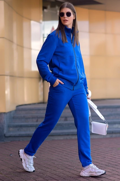 Костюм женский повседневный, спортивного стиля из комфортной ткани ( петельного футера тринитки), состоящий из джемпера и брюк. Джемпер – прямого силуэта, с застежкой молнией по перееду, по низу изделия с притачной манжетой с воротником - стойкой. На переде горизонтальные подрезы, карманы обработаны в рельефных швах, фиксирующие кнопкой. вышивка - логотип в цвет ткани на левой стороне переда. Рукава втачные одношовные длинные с притачной по низу манжетой. Отделочные строчки вдоль молнии, по рельефным швам, входу в карман. Брюки немного зауженные к низу, с притачным поясом на резинке и шнурком внутри. Передняя половинка брюк с боковыми карманами.