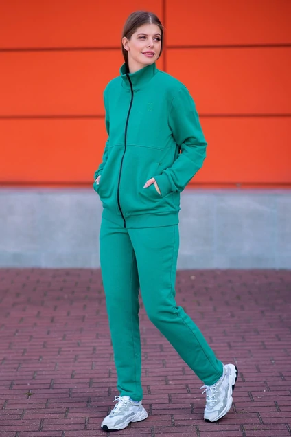 Костюм женский повседневный, спортивного стиля из комфортной ткани ( петельного футера тринитки), состоящий из джемпера и брюк. Джемпер – прямого силуэта, с застежкой молнией по перееду, по низу изделия с притачной манжетой с воротником - стойкой. На переде горизонтальные подрезы, карманы обработаны в рельефных швах, фиксирующие кнопкой. вышивка - логотип в цвет ткани на левой стороне переда. Рукава втачные одношовные длинные с притачной по низу манжетой. Отделочные строчки вдоль молнии, по рельефным швам, входу в карман. Брюки немного зауженные к низу, с притачным поясом на резинке и шнурком внутри. Передняя половинка брюк с боковыми карманами.