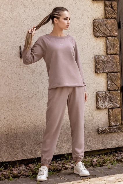 Костюм женский, повседневный, спортивного стиля из комфортной ткани, состоящий из свободного свитшота и джоггеров. Свитшот с широкой горловиной, с длинными рукавами-реглан, внизу с манжетами. По центру переда - вышивка-логотип в цвет ткани. Брюки длиной по щиколотку, с карманами на передних половинках, внутри пояса резинка. Внизу брюк кулиса, с резинкой внутри.
