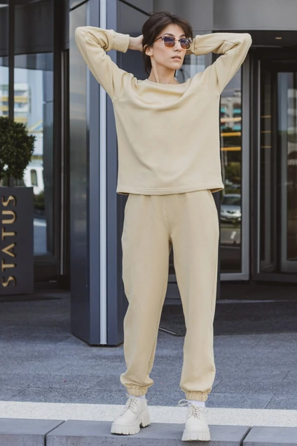Костюм женский, повседневный, спортивного стиля из комфортной ткани, состоящий из свободного свитшота и джоггеров. Свитшот с широкой горловиной, с длинными рукавами-реглан, внизу с манжетами. По центру переда - вышивка-логотип в цвет ткани. Брюки длиной по щиколотку, с карманами на передних половинках, внутри пояса резинка. Внизу брюк кулиса, с резинкой внутри.