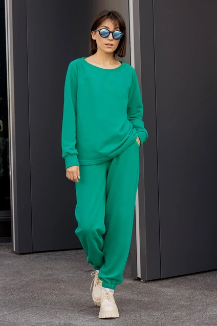 Костюм женский, повседневный, спортивного стиля из комфортной ткани, состоящий из свободного свитшота и джоггеров. Свитшот с широкой горловиной, с длинными рукавами-реглан, внизу с манжетами. По центру переда - вышивка-логотип в цвет ткани. Брюки длиной по щиколотку, с карманами на передних половинках, внутри пояса резинка. Внизу брюк кулиса, с резинкой внутри.
