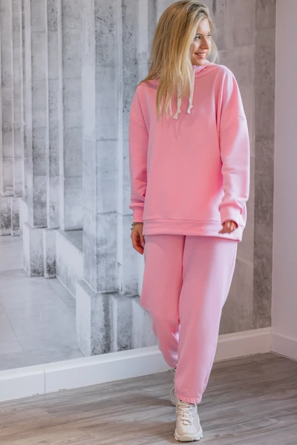 Костюм женский, повседневный, спортивного стиля из комфортной ткани (петельного футера 3-нитки), состоящий из худи оверсайз и брюк. Худи прямого силуэта со спущенной линией плеча, снизу с притачной планкой. Капюшон с кулисой по краю и шнурком внутри. Рукав длинный с манжетой (из ткани компаньона - кашкорсе) по низу в цвет. По центру переда - вышивка-логотип цвета. Брюки длиной по щиколотку, с карманами на передних половинках, внутри пояса резинка. Внизу брюк кулиса, с резинкой внутри.
