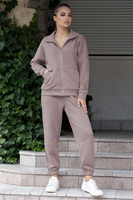 Стильный женский костюм спортивного стиля, свободного кроя, состоящий из брюк и джемпера. Джемпер с цельнокроенным рукавом, с застежкой -молнией по центру, с модельными треугольными резами на переде. Удобные карманы в нижней части полочки, вышивка- логотип на левой стороне в цвет ткани. Манжеты рукавов, планка по низу изделия, воротник, пояс брюк выполнен из ткани-компаньена кошкорсе в цвет основной ткани.Футер 3-нитка диагональ (без начёса) качества пенье.