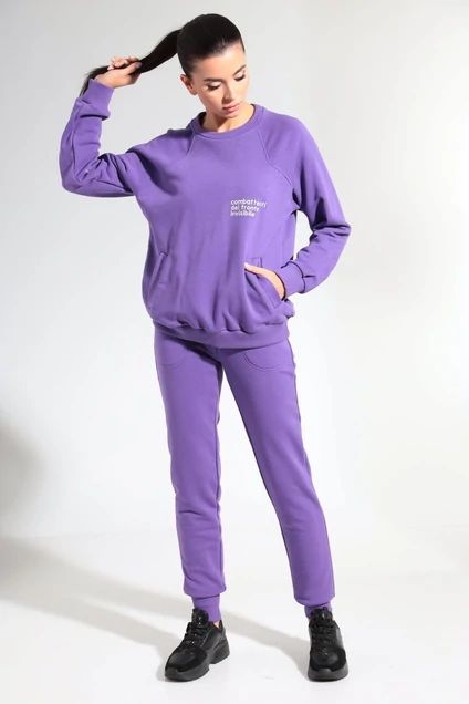 Женский костюм выполнен из хлопкового футера 3х-нитка. Свободного прилегания свитшот с прорезными карманами, украшенный по переду вышивкой. Манжеты и низ на трикотажном довязе кашкорсе в цвет изделия. Брюки с боковыми карманами, пояс на резинке, по низу манжеты на трикотажном довязе кашкорсе. Длина свитшота по спинке 64 (+/-1 см)., длина рукава от горловины 75 (+/-1 см). Длина брюк по боковому шву 102 см., по шаговому шву 81см. Рост модели на фото 171 см.