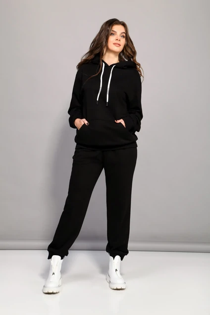 Костюм женский спортивный, сотоящий из худи и брюк-джогеров, выполненный из трикотажного полотна "футер" 3-х нитка, петля-пенье. Худи прямого свободного силуэта, с двойным капюшоном, спущенной линией плеча, длинным рукавом и карманом "кенгуру" по переду. Низ рукава и худи обработан манжетой из кашкорсе в цвет изделия. Спинка без конструктивных элементов. Брюки-джогеры с поясом на резнике и шнурком, в боковых швах карманы, низ брюк на манжете из кашкорсе. Длина рукава 60см, длина худи 70см, длина брюк с поясом 105см.