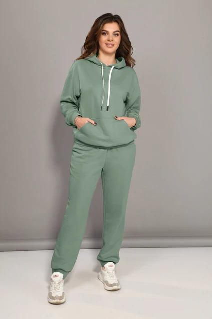 Костюм женский спортивный, сотоящий из худи и брюк-джогеров, выполненный из трикотажного полотна "футер" 3-х нитка, петля-пенье. Худи прямого свободного силуэта, с двойным капюшоном, спущенной линией плеча, длинным рукавом и карманом "кенгуру" по переду. Низ рукава и худи обработан манжетой из кашкорсе в цвет изделия. Спинка без конструктивных элементов. Брюки-джогеры с поясом на резнике и шнурком, в боковых швах карманы, низ брюк на манжете из кашкорсе. Длина рукава 60см, длина худи 70см, длина брюк с поясом 105см.