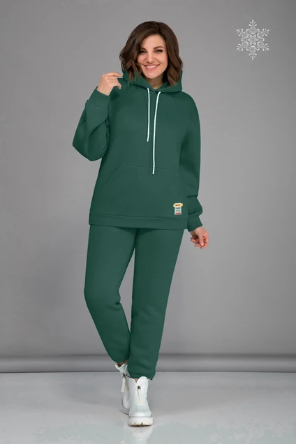 Костюм женский спортивный, состоящий из худи и брюк-джоггеров, выполненный из трикотажного полотна "футер" 3-х нитка-начес. Худи прямого свободного силуэта, с двойным капюшоном, спущенной линией плеча, длинным рукавом и карманом "кенгуру" по переду. Низ рукава и худи обработан манжетой из основной ткани. Спинка без конструктивных элементов. Брюки-джоггеры с поясом на резнике, в боковых швах карманы, низ брюк на резинке. Длина рукава 60см, ширина плеча 17см, длина худи 66см, длина брюк с поясом 103,5см. Декоративные элементы могут быть изменены.