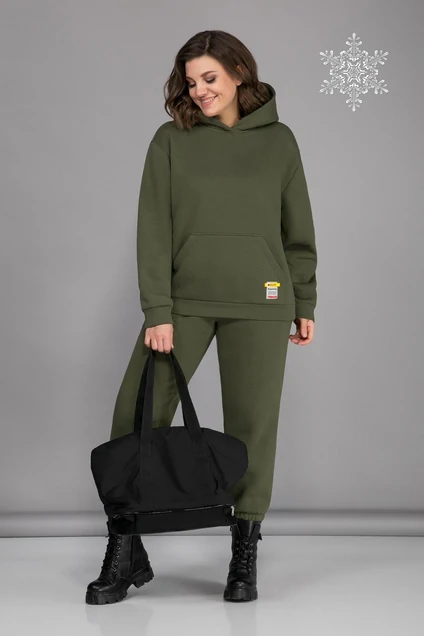 Костюм женский спортивный, состоящий из худи и брюк-джоггеров, выполненный из трикотажного полотна "футер" 3-х нитка-начес. Худи прямого свободного силуэта, с двойным капюшоном, спущенной линией плеча, длинным рукавом и карманом "кенгуру" по переду. Низ рукава и худи обработан манжетой из основной ткани. Спинка без конструктивных элементов. Брюки-джоггеры с поясом на резнике, в боковых швах карманы, низ брюк на резинке. Длина рукава 60см, ширина плеча 17см, длина худи 66см, длина брюк с поясом 103,5см. Декоративные элементы могут быть изменены.