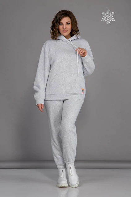 Костюм женский спортивный, состоящий из худи и брюк-джоггеров, выполненный из трикотажного полотна "футер" 3-х нитка-начес. Худи прямого свободного силуэта, с двойным капюшоном, спущенной линией плеча, длинным рукавом и карманом "кенгуру" по переду. Низ рукава и худи обработан манжетой из основной ткани. Спинка без конструктивных элементов. Брюки-джоггеры с поясом на резнике, в боковых швах карманы, низ брюк на резинке. Длина рукава 60см, ширина плеча 17см, длина худи 66см, длина брюк с поясом 103,5см. Декоративные элементы могут быть изменены.