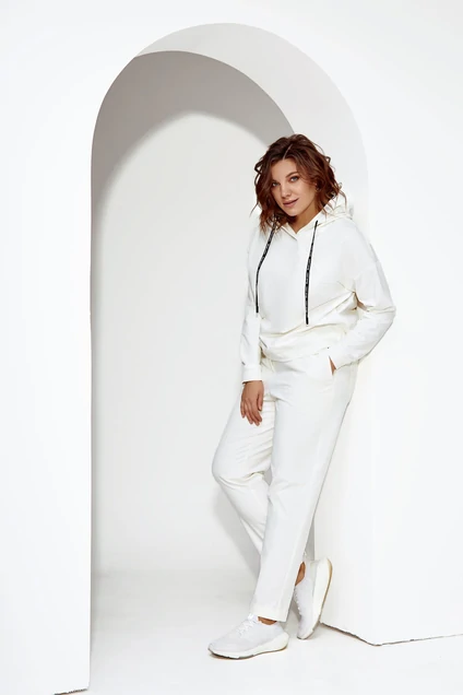 Костюм женский повседневный в спортивном стиле из комфортной ткани( футер, класс пенье), состоящий из худи и джинсов. Худи прямого силуэта с декоративным подрезом по переду. Рукава со спущеной линией плеча, снизу с притачной манжетой. Капюшон с кулисой по краю и шнурком внутри. По низу худи притачная планка. Джинсы прямого силуэта из хлопка с карманами на передних половинах. Пояс отрезной на резинке. По низу брюк отложная манжета, функциональные настрочные карманы по задним половинкам брюк.