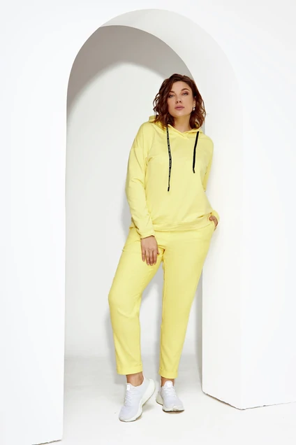 Костюм женский повседневный в спортивном стиле из комфортной ткани( футер, класс пенье), состоящий из худи и джинсов. Худи прямого силуэта с декоративным подрезом по переду. Рукава со спущеной линией плеча, снизу с притачной манжетой. Капюшон с кулисой по краю и шнурком внутри. По низу худи притачная планка. Джинсы прямого силуэта из хлопка с карманами на передних половинах. Пояс отрезной на резинке. По низу брюк отложная манжета, функциональные настрочные карманы по задним половинкам брюк.