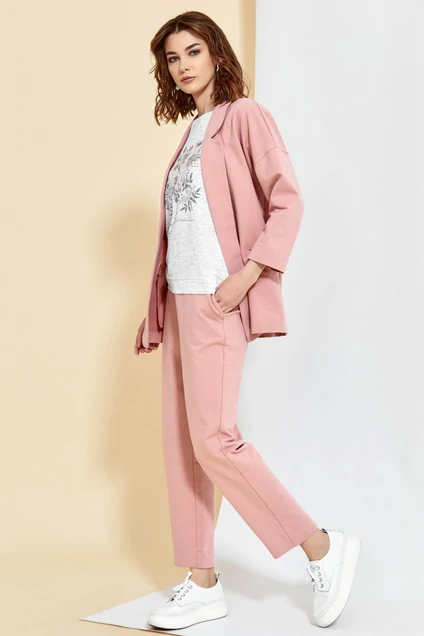 Костюм: жакет + брюки. Жакет свободного кроя прямого силуэта из трикотажного полотна. Без подкладки, с отложным шалевым воротником. По переду прорезные карманы с листочкой. Линия плеча спущена. Рукав ¾. По рукаву и спинке авторский принт. Брюки прямого кроя, по переду карманы с наклонным входом. По спинке справа прорезной нефункциональный карман с листочкой. Брюки с притачным поясом, по спинке резинка. В области кармана авторский принт. Длина жакета 73 см. Длина рукава от горловины/ Длина брюк 64 см /104 см.