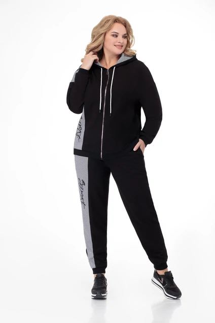 Костюм выполнен из комфортного трикотажного полотна состоит из джемпера и брюк. Джемпер прямого силуэта, со спущенным плечом. На правой полочке рельеф из отделочной ткани в клетку, выходящий из плечевого шва, декорирован принтом. Спинка стачная. Рукав втачной, одношовный. По низу джемпера и рукавов - довязы. Горловина оформлена капюшоном, внутренняя часть которого из отделочной ткани, в поддержку рельефа. В отлете капюшона - декоративный шнур. Брюки прямого силуэта, слегка зауженные к низу. Правая половинка комбинированная с отделочной тканью, в поддержку джемпера, которая декорирована принтом. В боковых швах обработаны карманы. Верхний срез брюк оформлен поясом с эластичной тесьмой. По низу брюк – манжеты.