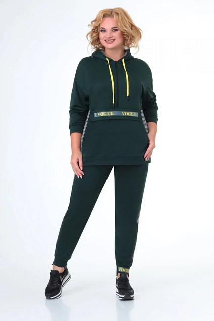 Комплект из комфортного трикотажного полотна, состоит из джемпера прямого силуэта , со спущенной линией плеча и брюк. Перед отрезной по линии талии, в верхней части обработана застежка - молния. Нижняя часть из отделочной ткани, с накладным карманом «кенгуру» и настрочным декором. Спинка цельная. Рукав втачной одношовный , по низу- притачная манжета. Горловина оформлена капюшоном из двух видов ткани, в отлете декоративный шнур. По низу джемпера – притачная манжета. Брюки прямого силуэта, слегка зауженные к низу. По бокам лампасы из отделочной ткани, в шве обработаны карманы. Верхний срез оформлен поясом с эластичной тесьмой. По низу притачные разноуровневые манжеты.
