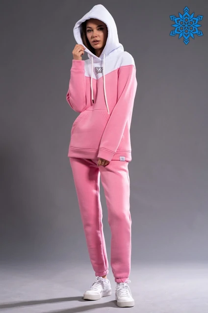 Худи с двухцветным дизайном привлекает внимание благодаря отделочной кокетке. Она добавляет неповторимости и стиля этому утепленному комплекту.