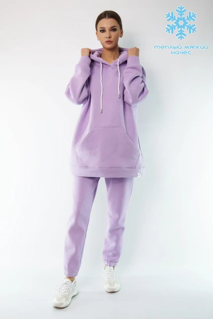Костюм ОВЕРСАЙСЗ утепленный на флисе. Удлиненная худи Оверсайз модели 4054 с капюшоном на подкладке из основной ткани. Брюки модели 4053 средней посадки зауженные к низу с карманами в боковых швах. Обработка низа брюк резинка. Ткань футер (3-х ниточный) с внутренним слоем утепленным начесом, качество Пенье, плотность 395 г.м2