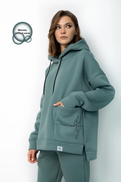 Костюм Oversize, утепленный на флисе. Худи Oversize модели 4057 с капюшоном на подкладке из основной ткани, с боковыми накладными карманами, с боковыми разрезами по низу изделия, удлиненная спинка. Брюки модели 4056 средней посадки зауженные к низу с карманами в боковых швах. Обработка низа брюк резинка. Ткань футер (3-х ниточный) с внутренним слоем утепленным начесом, качество Пенье, плотность 395 г.м2 Правила стрки: - Только ручная стирка 30 градусов